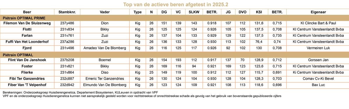 In de jongste testronde (2025.2) sprong één beer er duidelijk bovenuit: Filemon van de Sluizenweg. Deze Piétrain, gefokt door Marc Peters uit Millen en eigendom van KI Clincke uit Ruiselede, overtuigde met opvallende prestaties.